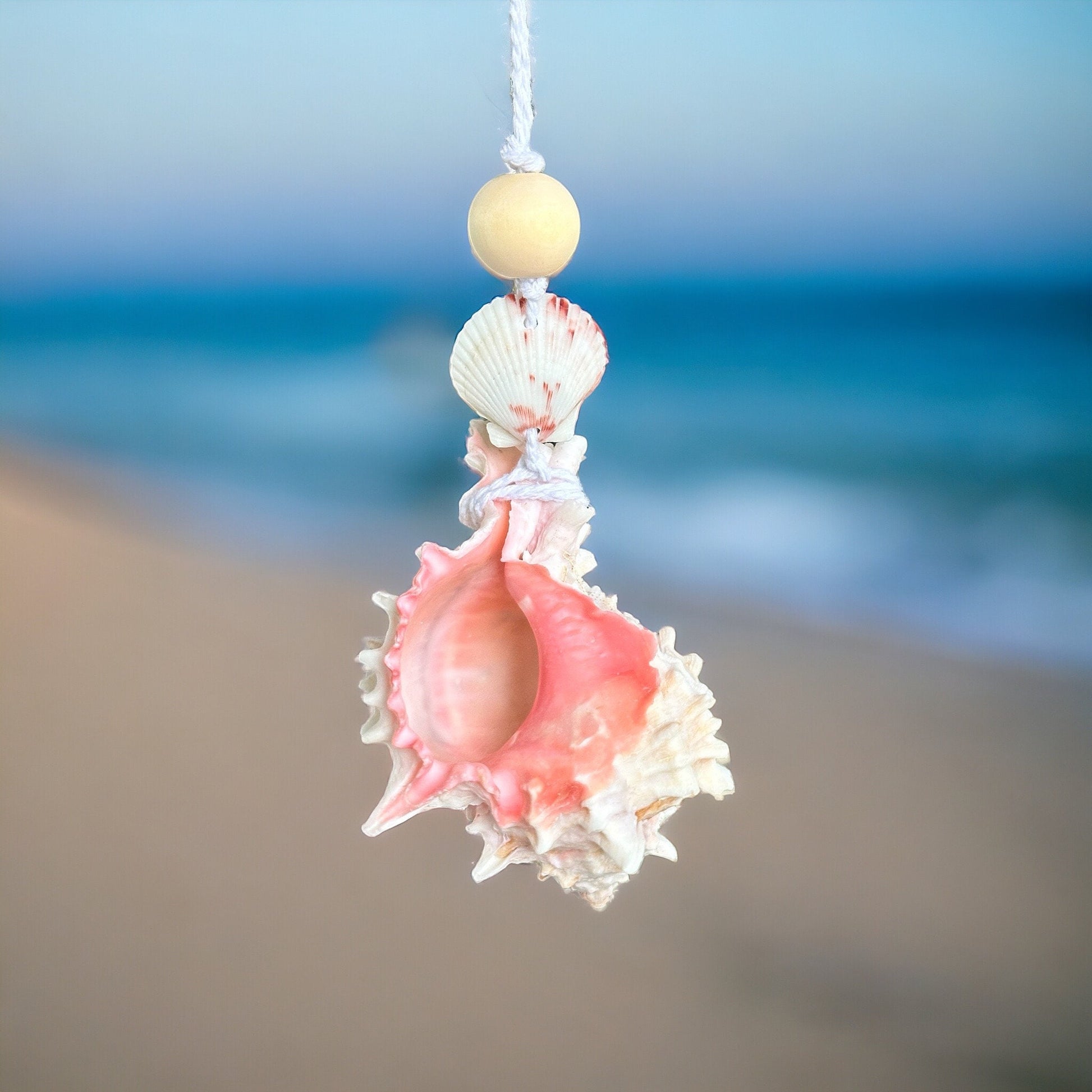 Add a touch of coastal beauty to your car with our Pink Murex Shell Car Charm Diffuser. This handmade accessory features a natural pink murex shell and a handpicked Floridian cockle shell, bringing the beach to your daily drive. The charm hangs from an adjustable white twine, perfectly complementing the laid-back, tropical summer vibe.