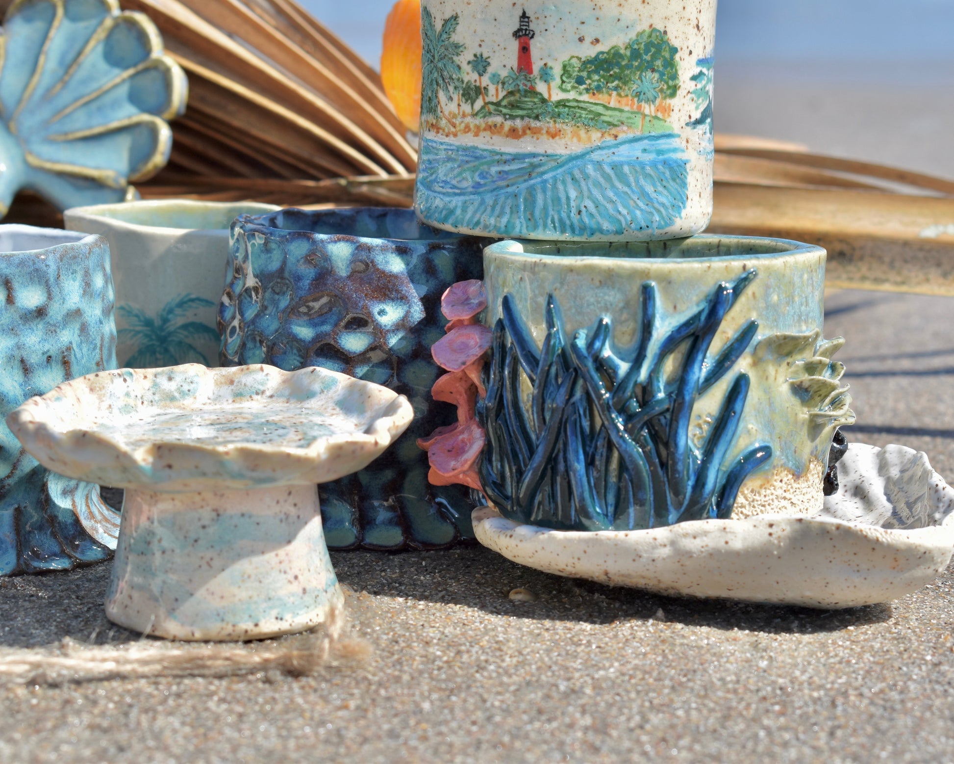 Hand-sculpted ceramic cup featuring a coral reef, finished with a glossy ocean-toned interior. Textured, coastal-inspired design with dimensional elements throughout.