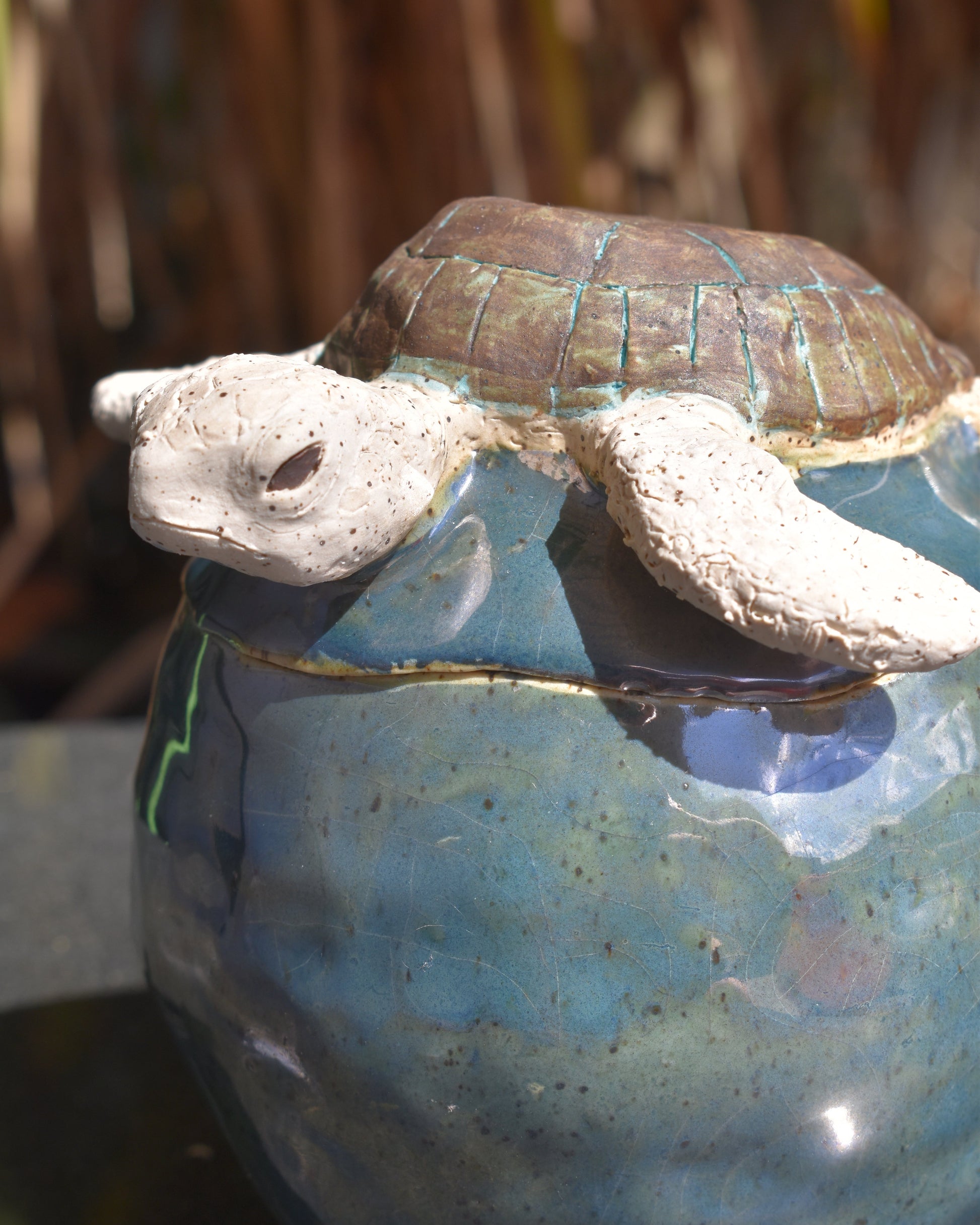 A sculptural ceramic vessel inspired by the sea turtles that nest along the shores of Juno Beach. Finished in layered ocean glazes that echo the shifting tones of Atlantic waters, the piece is crowned with a hand-formed turtle resting on the lid.
