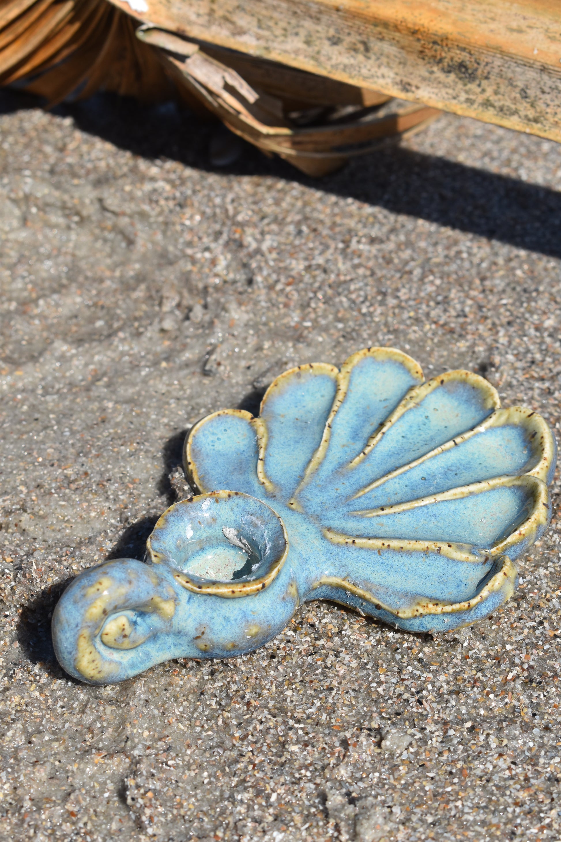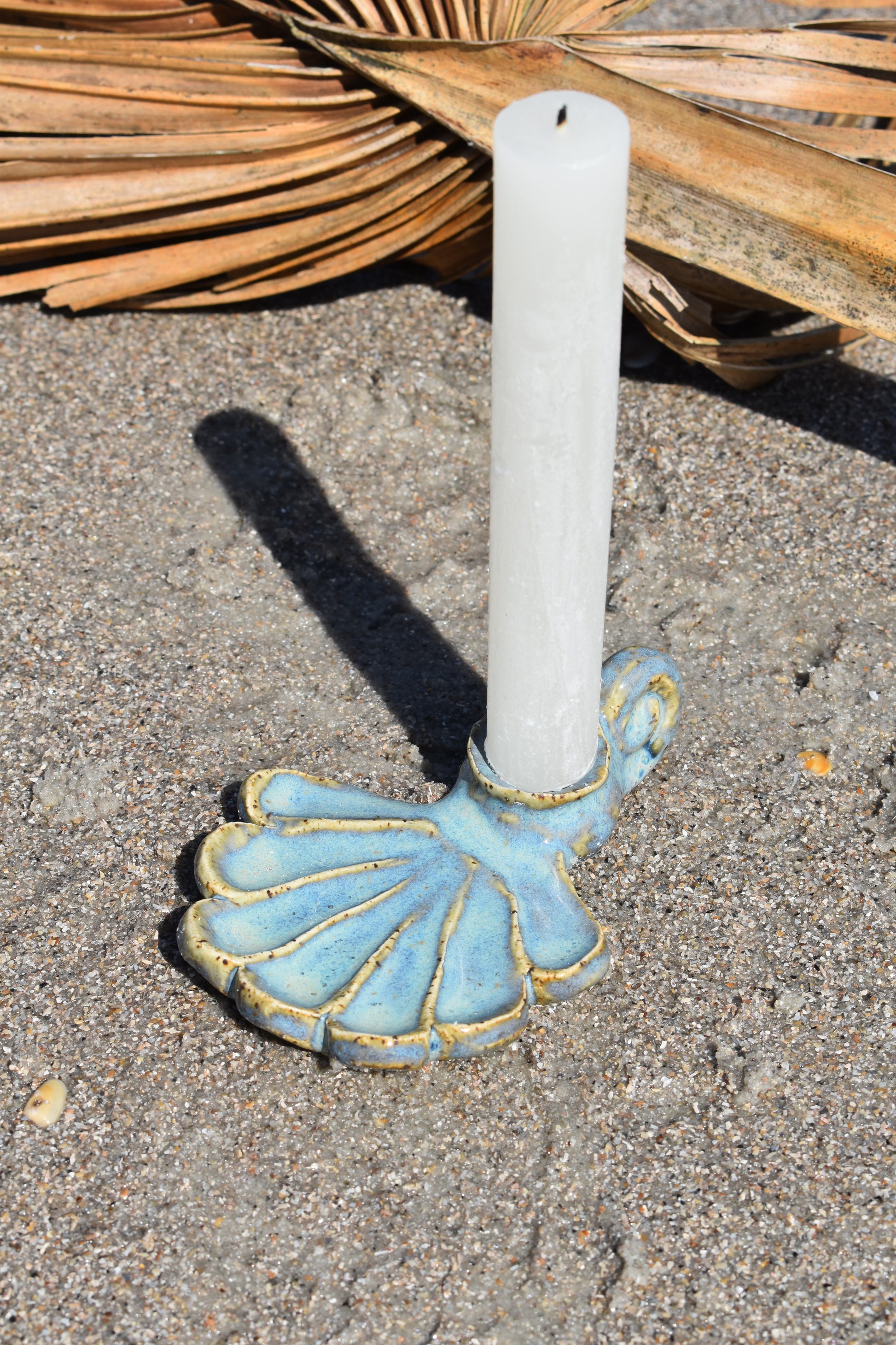 Hand-sculpted ceramic taper holder inspired by scallop shells at low tide. Finished in a weathered ocean-blue glaze with warm, sandy edges that highlight the sculpted details.